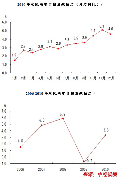 居民消费价格一季度同比上涨2.2%,二季度上涨2.9%,三季度上涨3.5%,四季度上涨4.7%,全年平均比上年上涨3.3%,其中食品价格上涨7.2%。固定资产投资价格上涨3.6%。工业品出厂价格上涨5.5%。原材料、燃料、动力购进价格上涨9.6%。农产品生产价格上涨10.9%。