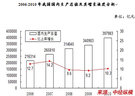 2010年国内生产总值397983亿元,比上年增长10.3%。其中,第一产业增加值40497亿元,增长4.3%;第二产业增加值186481亿元,增长12.2%;第三产业增加值171005亿元,增长9.5%。第一产业增加值占国内生产总值的比重为10.2%,第二产业增加值比重为46.8%,第三产业增加值比重为43.0%。