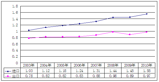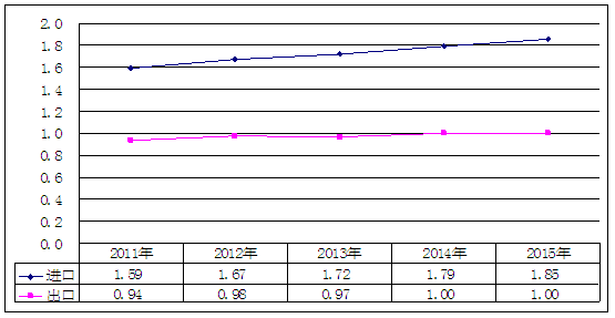 前边 分析 显示,前几年我国印染产品进出口价格较为平稳,预计未来几年仍然会保持相对稳定,到2015年进口价格在1.85美元/米左右,出口价格在1美元/米左右。