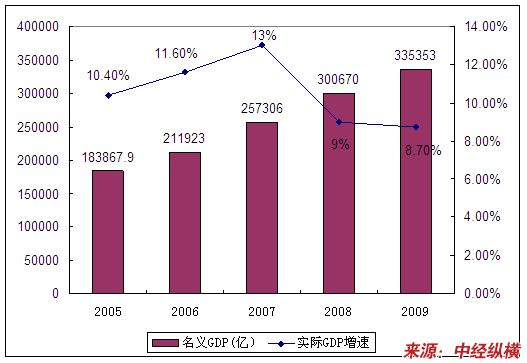 2009年国内生产总值335353亿元,比上年增长8.7%。分产业看,第一产业增加值35477亿元,增长4.2%;第二产业增加值156958亿元,增长9.5%;第三产业增加值142918亿元,增长8.9%。第一产业增加值占国内生产总值的比重为10.6%,比上年下降0.1个百分点;第二产业增加值比重为46.8%,下降0.7个百分点;第三产业增加值比重为42.6%,上升0.8个百分点。