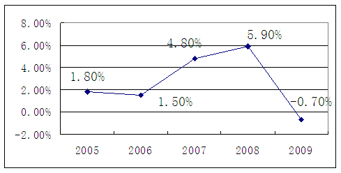 2009年居民消费价格比上年下降0.7%,其中食品价格上涨0.7%。固定资产投资价格下降2.4%。工业品出厂价格下降5.4%,其中生产资料价格下降6.7%,生活资料价格下降1.2%。原材料、燃料、动力购进价格下降7.9%。农产品生产价格下降2.4%。农业生产资料价格下降2.5%。70个大中城市房屋销售价格上涨1.5%,其中新建住宅价格上涨1.3%,二手住宅价格上涨2.4%;房屋租赁价格下降0.6%。