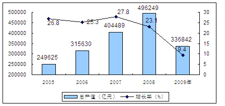 初步测算,2009年全年国内生产总值335353亿元,按可比价格计算,比上年增长8.7%,增速比上年回落0.9个百分点。