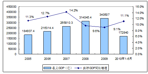 由上图可知,近年来我国国内生产总值(GDP)一直保持高速增长,增长幅度均超过了9%。虽然受世界性经济危机的影响,我国2008和2009年的GDP增长幅度有所下降,但2010年的前2个季度的经济增长幅度出现回升。