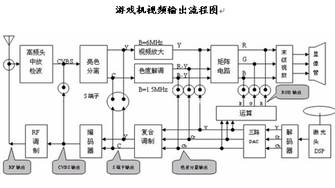 图上半部分是家用电视机(显示器、投影机)的方框流程图;最右侧是“终点”;下半部分是游戏机或其它信号源的方框流程图。最右侧是“起点”。