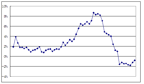 (二)2008年7月至10月间,国内外经济局势不确定性风险增大,物价有所回落,宏观调控政策以保增长和控物价为宏调首要任务