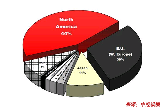 美国市场在IVD市场占据支配地位。美国占据44%的全球IVD 市场,价值185亿美元。分子测试、基于医院的患者护理的增长,特别是在急诊护理、糖尿病自我检测、癌症和自身免疫疾病测试上的增长填补了价格压力,一些专业的自身免疫测试、糖尿病和心血管市场测试整合进化学/免疫化学工作站。因此美国的IVD市场将以年增速5%于2012年达230亿美元。此外,根据现代医疗技术委员会的数据,美国公司生产了全球80%的IVD产品。