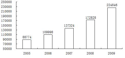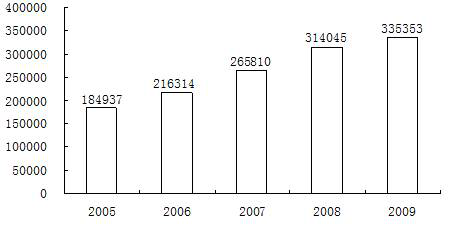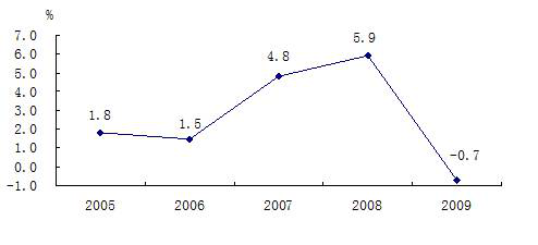 2009年国内生产总值335353亿元,按可比价格计算,比上年增长8.7%,增速比上年回落0.9个百分点。分季度看,一季度增长6.2%,二季度增长7.9%,三季度增长9.1%,四季度增长10.7%。分产业看,第一产业增加值35477亿元,增长4.2%;第二产业增加值156958亿元,增长9.5%;第三产业增加值142918亿元,增长8.9%。