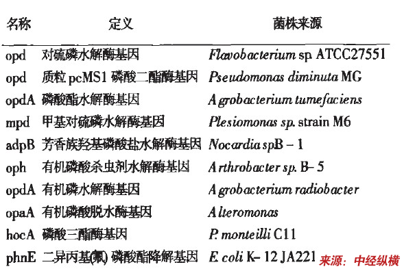 目前已从不同的微生物中分离到各种有机磷农药降解基因。下表列出了近年来国内外报道的几种有机磷农药降解基因的情况。