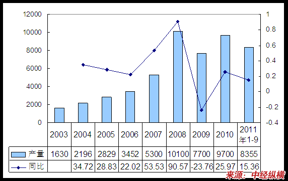2003-2011年9月中国橡胶防腐衬里产量及同比增长