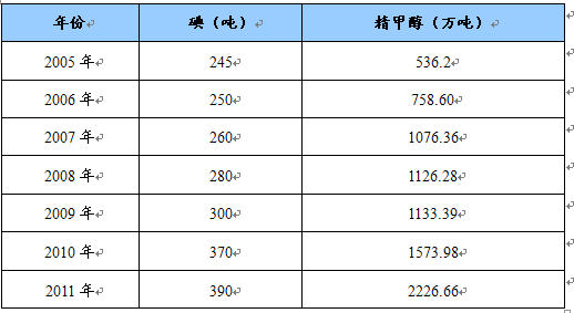 中国是一个碘需求大国,碘需求量从2004年的1900吨增长到2010年的3684吨,年平均增长率为13.7%,近年来中国市场碘需求增长明显的 行业 (产品)是造影剂 行业 、氟化工 行业 、液晶 行业 和碘甲烷,而且这些 行业 未来在中国的增长依然强劲。而中国每年碘产量只有390吨左右(海藻碘120吨,回收碘270吨),近几年随着海带含碘量的减少,海藻碘产量有所萎缩。目前中国碘主要依赖进口,进口依赖度很高,进口国主要是智利、日本和土库曼斯坦。