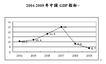 2009年国内生产总值335353亿元,按可比价格计算,比上年增长8.7%,增速比上年回落0.9个百分点。分季度看,一季度增长6.2%,二季度增长7.9%,三季度增长9.1%,四季度增长10.7%。分产业看,第一产业增加值35477亿元,增长4.2%;第二产业增加值156958亿元,增长9.5%;第三产业增加值142918亿元,增长8.9%。