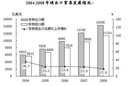 2009年国内进出口总额全年下降,自11月份由降转升。全年进出口总额22073亿美元,比上年下降13.9%。11月份进出口总额同比涨幅由负转正,当月增长9.8%,12月份增长32.7%。去年全年的出口12017亿美元,下降16%;进口10056亿美元,下降11.2%。进出口相抵,去年的贸易顺差1961亿美元,比上年减少994亿美元。