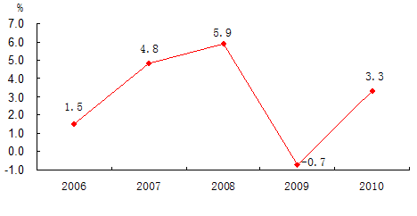 初步核算,2010全年中国国内生产总值397983亿元,比上年增长10.3%。其中,第一产业增加值40497亿元,增长4.3%;第二产业增加值186481亿元,增长12.2%;第三产业增加值171005亿元,增长9.5%。第一产业增加值占国内生产总值的比重为10.2%,第二产业增加值比重为46.8%,第三产业增加值比重为43.0%。