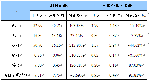 1~3月,化纤 行业 实现利润总额82.99亿元,同比大幅增加1.04倍;亏损企业亏损额3.79亿元,同比减少15.4%;全 行业 亏损面14.29%。分 行业 看:涤纶 行业 50.7亿元,同比大幅增加2.14倍,占全 行业 利润的61.1%;人纤 行业 实现利润16.8亿元,同比增加27.42%,占全 行业 的20.24%;锦纶 行业 利润总额也大幅增长1.26倍,达到7.8亿元;腈纶 行业 微利0.36亿元,但增幅高达5.1倍;其他合成纤维 行业 利润小幅减少5.69%。