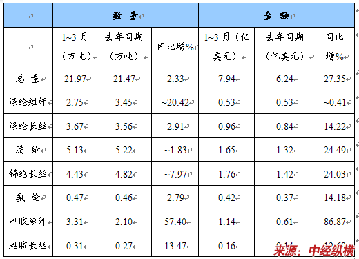 1~3月,我国累计进口化纤21.97万吨,同比小幅增长2.33%,而进口金额则大幅增长27.35%,说明进口价格明显提高。分品种看,粘胶短纤进口量同比迅速增长57.4%,涤纶长丝和氨纶进口量分别小幅增长2.91%和2.79%,而涤纶短纤、锦纶长丝和腈纶进口量则有不同程度的减少,同比分别下降20.42%、7.97%和1.83%。