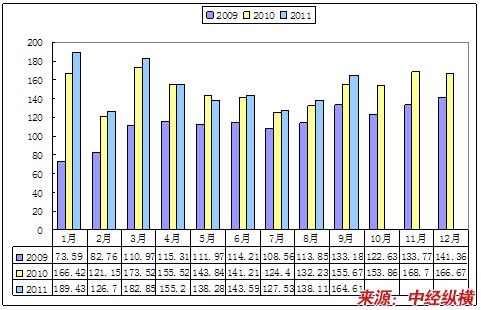 2009-2011年汽车月度销售变动趋势示意图 单位:万辆