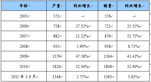 2005-2011年9月中国汽车产销量及同比增长 单位:万辆