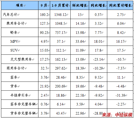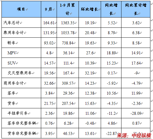 1-9月,汽车累计产销1346.12万辆和1363.35万辆,同比增长2.75%和3.62%。其中:乘用车累计产销1048.50万辆和1053.78万辆,同比增长6.04%和6.38%;商用车累计产销297.62万辆和309.57万辆,同比下降7.37%和4.79%。