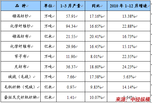 2011年1~3月化纤下游主要相关品种生产情况