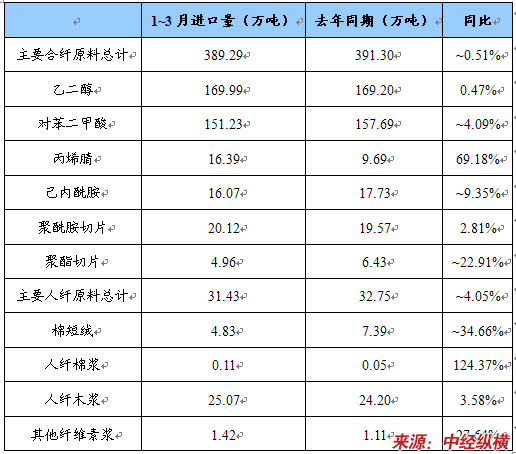 1~3月,国内化纤原料依然短缺。主要合纤原料共计进口389.29万吨,与去年同期基本持平,其中进口量最大的是乙二醇,达170万吨,占合纤原料进口总量的43.67%。随着国内PTA产能的增长,进口PTA小幅下降4.09%,进口量为151.23万吨,占38.85%。主要人纤原料共计进口31.43万吨,同比小幅下降4.05%,其中人纤木浆进口25.07万吨,同比略增3.58%;棉短绒进口4.83万吨,大幅下降34.66%,占15.36%。