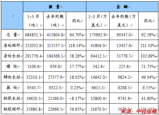 1~3月,化纤出口迅速增加,出口量达到68.48万吨,同比增长64.7%,出口金额也大幅增长92.58%。分品种看,涤纶短纤和涤纶长丝出口量增幅分别高达118.14%和58.26%,粘胶短纤出口量增幅也高达56.65%,锦纶长丝增长18.02%,氨纶出口量与去年同期基本持平,粘胶长丝出口量则下降8.17%。1~3月份化纤产品净出口46.51万吨。