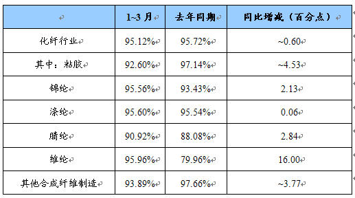 1~3月,化纤 行业 平均产销率为95.12%,同比略降0.6个百分点。涤纶 行业 为95.6%,基本与去年同期持平;粘胶 行业 仅92.6%,同比下降4.53个百分点;其他合成纤维 行业 为93.89%,同比下降3.77个百分点。反映出产销衔接不畅。