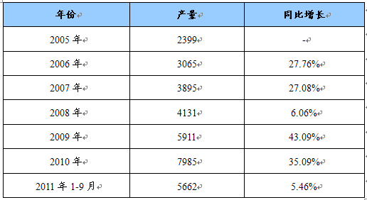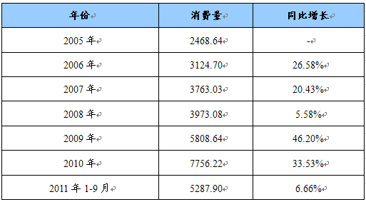 2005-2011年9月中国汽车座椅面料消费量及同比增长 单位:万平米