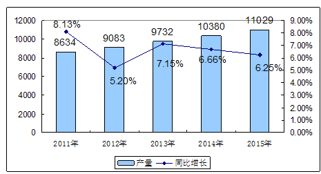 2011-2015年中国汽车座椅面料产量及同比增长预测 单位:万米