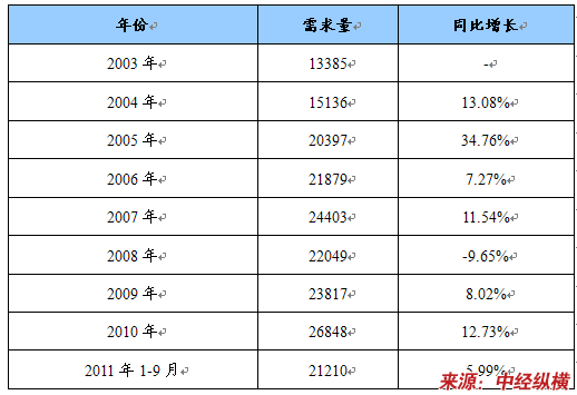 2003-2011年9月中国强化复合地板需求量及同比增长 单位:万平方米