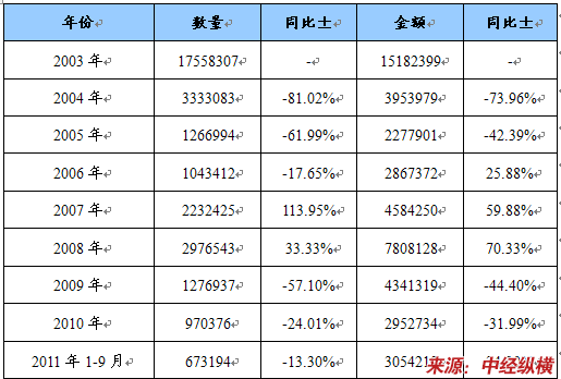 2003-2011年9月中国强化复合地板进口数量金额统计 单位:千克,美元