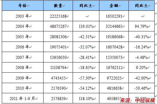 2003-2011年9月中国强化复合地板出口数量金额统计 单位:千克,美元