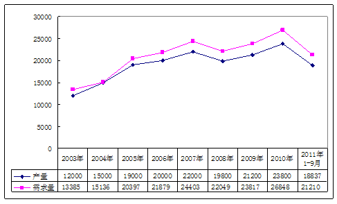 2003-2011年9月中国强化复合地板产量、需求量对比 单位:万平方米