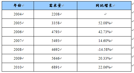 2004-2010年中国撬装式调压站需求量及同比增长 单位:台