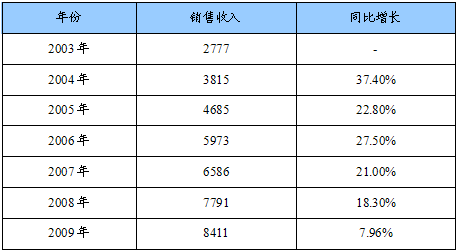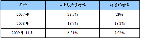 2009年初,总产值与销售额同比增幅只有2.6%和2.9%,达到改革开放以来的历史最低点。而与2009年1月份相比,11月的增幅只上升了4个百分点。因此,整体来看, 行业 的全年运行情况有所上升,但增幅不大。
