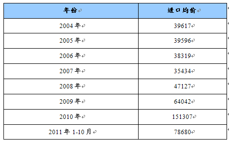 2004-2011年10月中国激光照排机进口均价 单位:美元/台