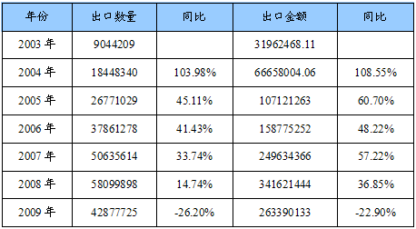2005-2009年汽车排气系统出口量、出口额及同比增长统计表