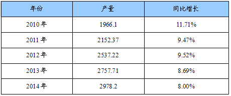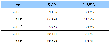 2010-2014年汽车排气系统需求量及同比增长预测表