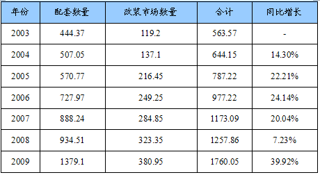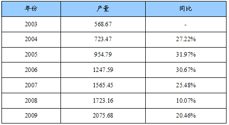 2003-2009年汽车排气系统需求量及同比增长统计表