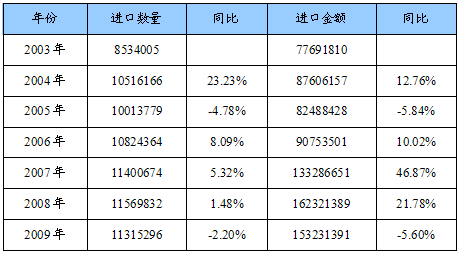 2003-2009年汽车排气系统进口量、进口额及同比增长统计表