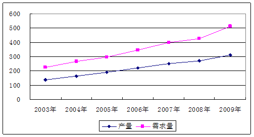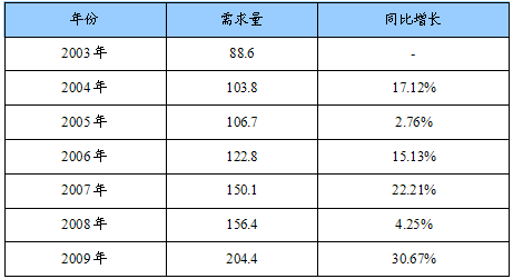 2003-2009年我国汽车前桥总成需求量及同比增长统计表