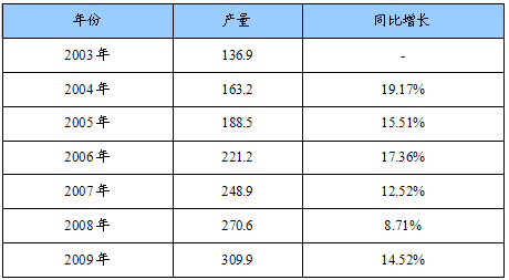 2003-2009年我国汽车前桥总成产量及同比增长统计表