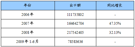 2006-2009年6月我国汽车前桥总成出口额及同比增长统计表
