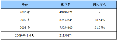 2006-2009年6月我国汽车前桥总成进口额及同比增长统计表