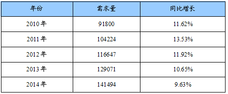 2010-2014年我国汽车滤纸需求量及同比增长预测表