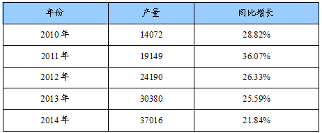 2010-2014年我国汽车滤纸产量及同比增长预测表
