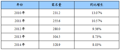 2010-2014年我国汽车前桥总成需求量及同比增长预测表