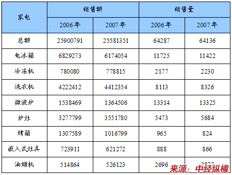 美国是美洲地区家电市场的生产与消费主体,2007年美国主要家电的销售额下降1.6%,为256亿美元,而销售量与2006年基本持平,仅下降0.2%,为6410万台。