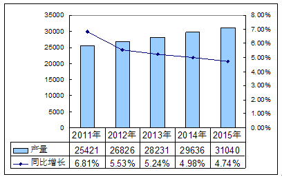 2011-2015年中国强化复合地板产量及同比增长预测 单位:万平米