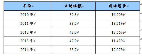 2010-2014年中国机房空调产品市场规模预测表 单位:亿元