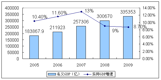 2009年国内生产总值335353亿元,比上年增长8.7%。分产业看,第一产业增加值35477亿元,增长4.2%;第二产业增加值156958亿元,增长9.5%;第三产业增加值142918亿元,增长8.9%。第一产业增加值占国内生产总值的比重为10.6%,比上年下降0.1个百分点;第二产业增加值比重为46.8%,下降0.7个百分点;第三产业增加值比重为42.6%,上升0.8个百分点。